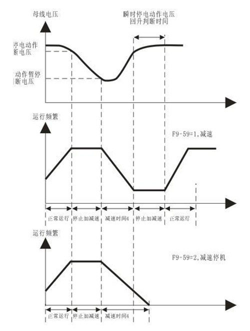 6.1此功能只在停電瞬間變頻器不會故障停機,而是降低輸出頻率,通過負載回饋能量,補充電壓降低,以維持變頻器短時間內(nèi)繼續(xù)工作。