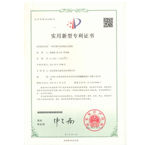 - 關(guān)于我們 - 資質(zhì)榮譽 - 一種可調(diào)節(jié)的對輥式壓球機